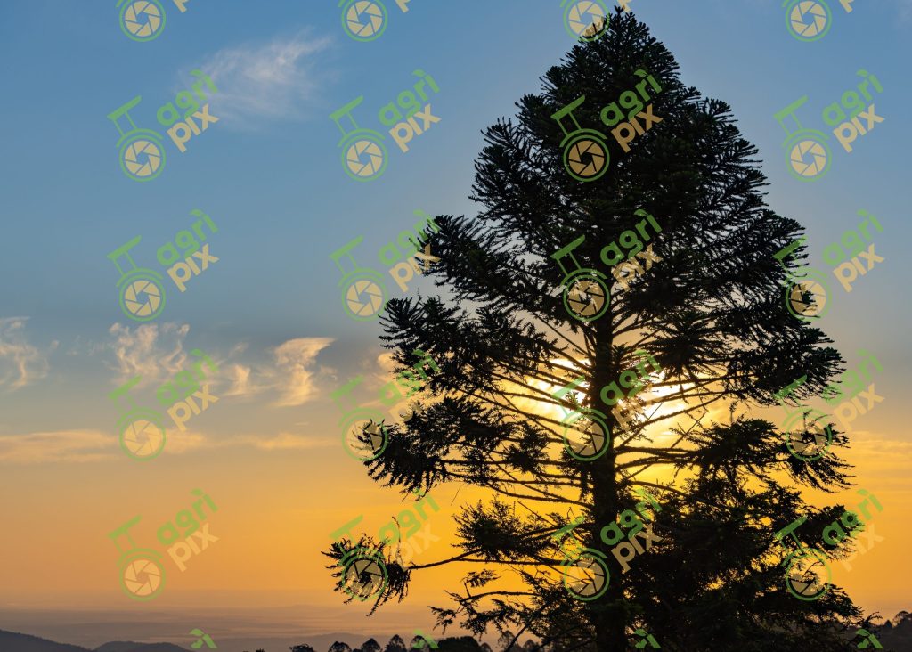 Bunya Pine (Araucaria bidwillii) taken at sunset in the Bunya Mountains Rainforest by Richard Cox