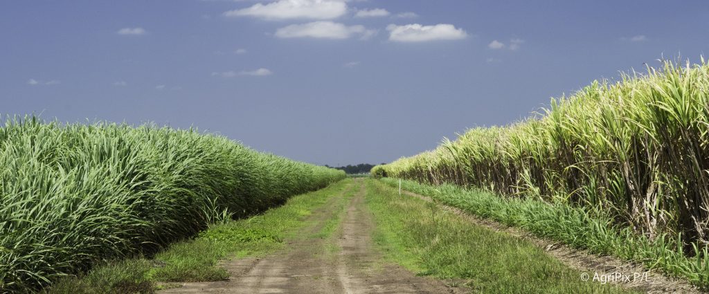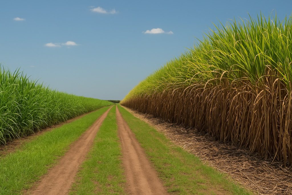 [Images: comparison of an AI generated image against an actual photo showing harvest-ready cane growing adjacent to a 9-month old 2nd year ratoon crop (on the left]